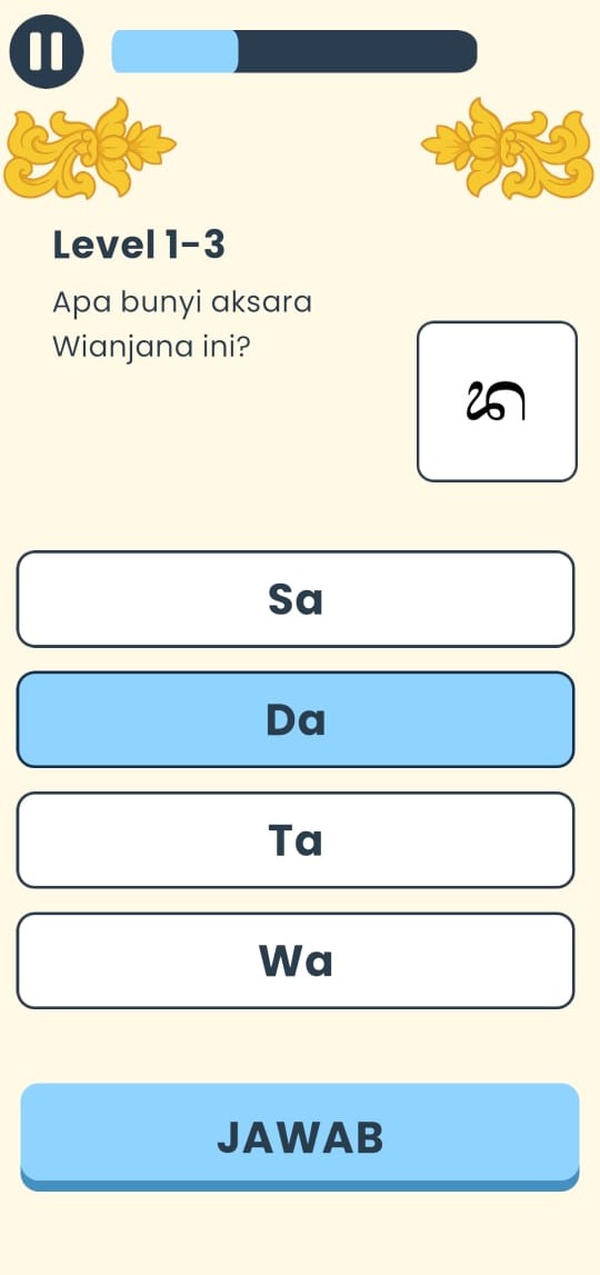 Permainan pendukung belajar dan literasi aksara Bali. Disini kamu dapat melihat bentuk huruf, mendengar suara aksara, mencoba menulis aksara, hingga mengikuti ujian kuis bertahap .